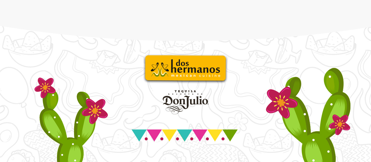 Ως γνήσιοι Μεξικάνοι, στο Dos Hermanos γιορτάζουμε κάθε χρόνο τη Cinco de Mayo διοργανώνοντας τη μεγαλύτερη μεξικάνικη φιέστα που έχεις δει ποτέ! Την Κυριακή 5 Μαΐου πιες όσες Margaritas Don Julio αντέχεις στην ειδική τιμή των 5€ και άσε τους χορευτές μας να σε οδηγήσουν σε ένα παραδοσιακό μεξικάνικο χορευτικό… χαμό στο πιο κεφάτο salsa party. Εννοείται ότι δεν θα λείπει το απαραίτητο συστατικό κάθε μεξικάνικης γιορτής: οι φημισμένες λιχουδιές του Dos Hermanos που θα φέρουν την όρεξη στο τραπέζι σου.